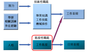 嚴格來說,職能測驗並不屬於人格測驗,但職能其中有一部分與人格是相關的,簡單的區分兩者,職能的概念著重於『可評估的外顯行為』,而人格指的是『內在的心理特徵』。如下圖所示。